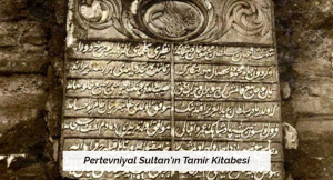 Eser 1943?de yıktırıldığında burada bulunan mezar taşları gibi, daha birçok parçalar ile birlikte Pertevniyal Sultan’ın adını veren 14 mısralık kitabe de bilinmeyen bir yere götürülmüştü.