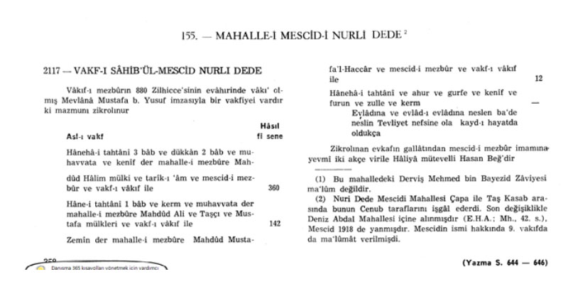 Vakıflar Genel Müdürlüğü’nce Kocaeli İl Özel İdaresi’ne satılmış olan Vakfiyeli Eserin bir dönem kız yurdu olarak kullanılan arsasındaki bina, daha sonra bir özel üniversite tarafından kiralanmıştır. Binanın arkasında halen Hazire mevcuttur. Kocaeli İl Özel İdaresi tarafından özel bir turizm şirketine satılacağı sırada 2013 yılında Derneğimizce tesbiti yapılan Nuri Dede/Nurlu Dede Mescidi’nin satışını durdurmak amacıyla Vakıflar 1. Bölge Müdürlüğü’ne, Kocaeli Valiliği’ne ve İstanbul IV. Kültür Varlıkları Koruma Bölge Kurulu Müdürlüğü’ne başvurulmuştur. Ayrıca ilgili Kurul’a tescili için de müracaat edilmiştir.